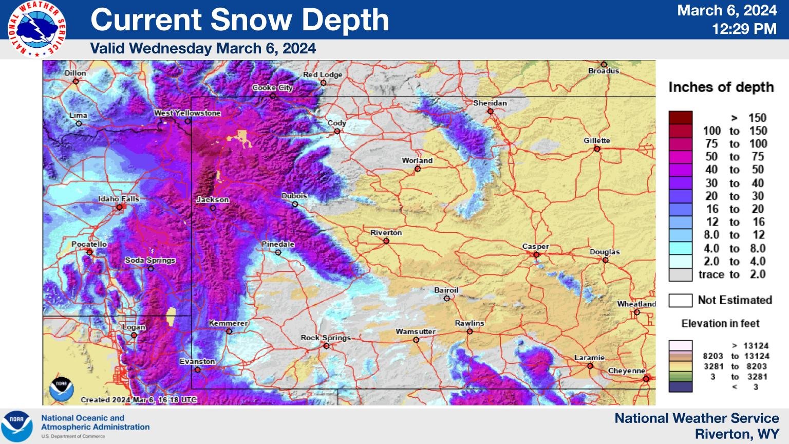 Snow Depth Map Wyoming – A map of estimated snow depths across the contiguous U.S. shows northern New Mexico and northwest Wyoming, up to 30 inches of snow may have accumulated. From the Oklahoma panhandle through . Since then, we’ve seen an additional 20+ cm’s fall, so we suspect the snow depth to be a little deeper, perhaps nudging the year of 2008 shown in light blue. This puts 2018 around fourth or fifth .
